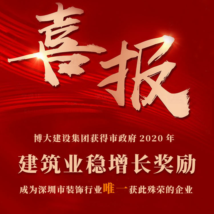 博大建設集團榮獲深圳市政府2020年建筑業穩增長獎勵,博大是獲此殊榮的唯一一家裝飾企業,當之無愧成為深圳市的行業龍頭,為行業爭光。