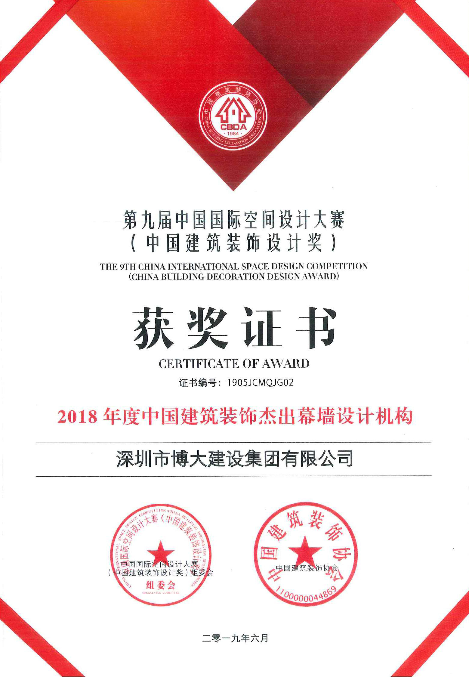 博大獲得2018年度中國建筑裝飾杰出幕墻設(shè)計機構(gòu),總裁李朕鴻榮獲商業(yè)方案類設(shè)計金獎,設(shè)計院院長方邵文榮獲娛樂空間方案類設(shè)計銀獎。