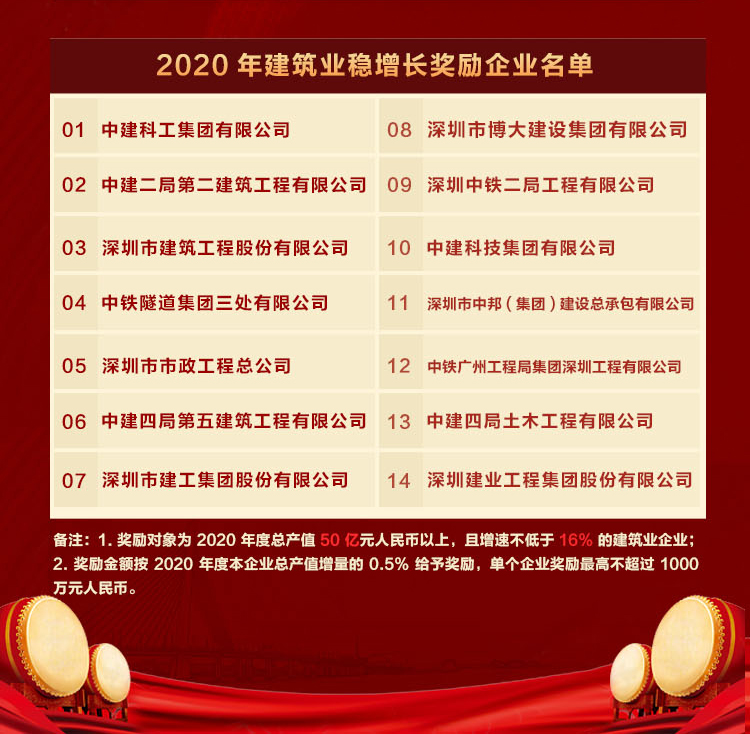 深圳市政府獎(jiǎng)勵(lì)政策規(guī)定:2020年總產(chǎn)值50億元人民幣以上、增速不低于16%的建筑業(yè)企業(yè),按照2020年本企業(yè)總產(chǎn)值增量的0.5%給予獎(jiǎng)勵(lì)。博大2020年產(chǎn)值增速遠(yuǎn)遠(yuǎn)超過(guò)政府規(guī)定的獎(jiǎng)勵(lì)標(biāo)準(zhǔn)。