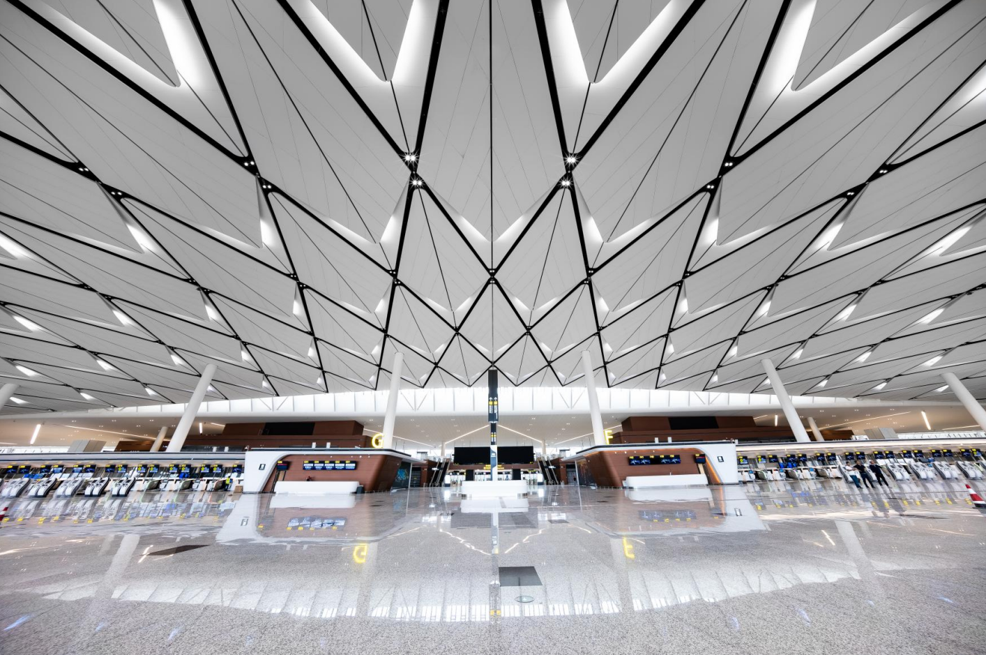 成都天府國(guó)際機(jī)場(chǎng)為4F級(jí)國(guó)際機(jī)場(chǎng)、是絲綢之路經(jīng)濟(jì)帶中等級(jí)最高的國(guó)際航空樞紐之一,中國(guó)首個(gè)“手拉手式”航站樓,總面積71萬㎡,每座航站樓有3萬㎡的羽毛狀吊頂與“太陽神鳥”的整體造型呼應(yīng) 。航站樓共設(shè)置83個(gè)廊橋機(jī)位,能夠滿足2025年2800萬人次國(guó)內(nèi)旅客吞吐量和1200萬人次國(guó)際旅客吞吐量的需求。預(yù)計(jì)本月開通運(yùn)營(yíng)。